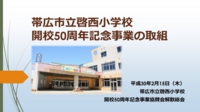 本校は昭和41年12月1日に開校し、これまで輝かしい伝統と校風を培い、開校50周年という歴史の大きな節目を迎えました。これまでの50年間の歩みを金字塔に、啓西小学校の更なる発展と充実を期し、同窓生や地域が相集い、「帯広市立啓西小学校開校50周年記念事業協賛会」を組織し、皆様のご協力を賜りながら、下記の記念行事や記念事業を実施いたしました。