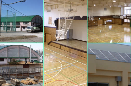 旧体育館(左側)と新体育館内部(中央と右上),ソーラーパネル(右下)